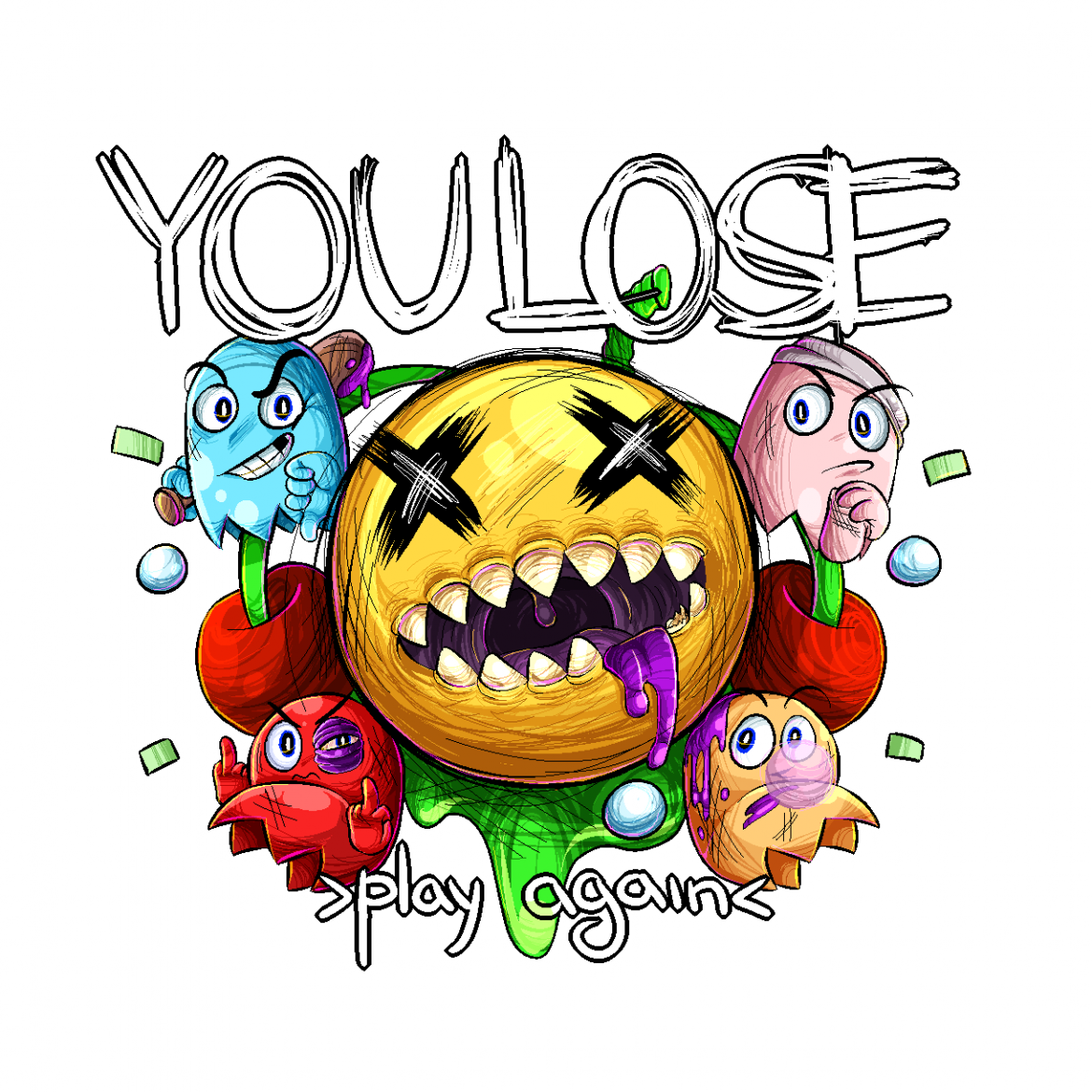 Идея как для стикера, наверное, прикольная, но исполнение никакое. Огромный размер с низкой детализацией. Все так криво, что даже линии кругов кривые. В рисунке нет ничего, что стоило бы внимания. Рисунок без эмоций, без стараний и без желания сделать что-то интересное. Выглядит как какая-то заготовка непонятно для чего. Это делается максимум за 10 минут с учетом придумывания.